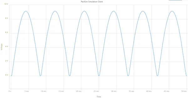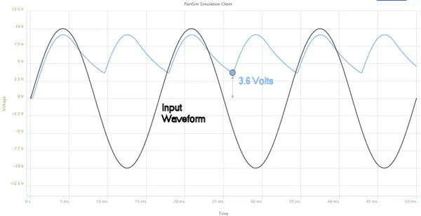 이로 인해 커패시터가 약 3.6V까지 방전됩니다. 이 예에서는 커패시터가 DC 펄스의 다음 양의 기울기에서 다시 한 번 재충전될 때까지 부하 저항기의 전압을 유지합니다. 즉, 커패시터는 다음 DC 펄스가 이를 피크 값까지 재충전하기 전에 잠시 방전할 시간만 갖습니다.