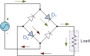D 1 ~ D 4 로 표시된 4개의 다이오드는 각 반주기 동안 전류를 전도하는 2개의 다이오드와 함께 "직렬 쌍"으로 배열됩니다. 공급 장치의 양의 반주기 동안 다이오드 D1 과 D2는 직렬로 연결되고 다이오드 D3 과 D4 는 역방향 바이어스되고 전류는 아래와 같이 부하를 통해 흐릅니다.