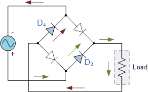전원의 음의 반주기 동안 다이오드 D3 과 D4는 직렬로 전도되지만 다이오드 D1 과 D2 는 이제 역방향 바이어스되므로 "OFF"로 전환됩니다. 부하에 흐르는 전류의 방향은 이전과 같습니다.