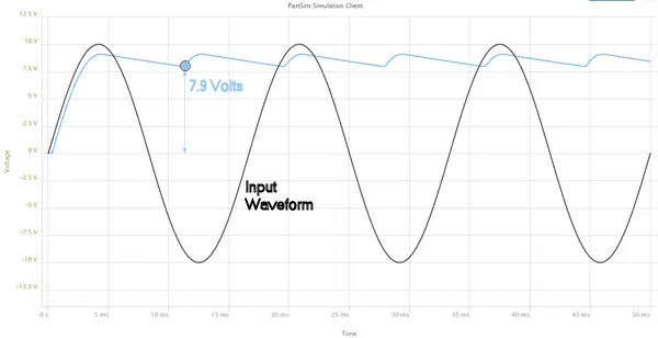 파형의 파란색 플롯은 정류기 출력 전체에 5.0uF 평활 커패시터를 사용한 결과를 보여줍니다. 이전에는 부하 전압이 정류된 출력 파형을 따라 0V까지 내려갔습니다. 여기서 5uF 커패시터는 출력 DC 펄스의 피크 전압까지 충전되지만 피크 전압에서 다시 0V로 떨어지면 회로의 RC 시간 상수로 인해 커패시터가 빠르게 방전될 수 없습니다.