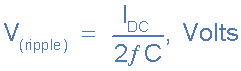 전파 정류기 회로 에 존재하는 최대 리플 전압은 평활 커패시터의 값뿐만 아니라 주파수 및 부하 전류에 의해 결정되며 다음과 같이 계산됩니다.