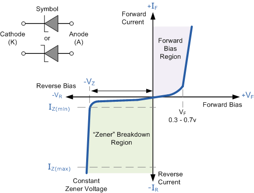 순방향 바이어스 방향, 즉 양극은 음극에 비해 더 양의 값을 가지며, 다이오드 양단 의 순방향 전압 V F 가 0.7V(실리콘)를 초과하여 제너 다이오드가 전도될 때 제너 다이오드는 일반 접합 다이오드처럼 동작합니다. 전도성 다이오드를 통해 흐르는 순방향 전류는 연결된 부하에 의해서만 최대값으로 결정됩니다. 따라서 순방향 바이어스 방향에서 제너는 지정된 전류 및/또는 전력 제한 내에서 일반 다이오드처럼 동작하므로 일반적으로 제너 다이오드의 순방향 특성은 중요하지 않습니다.