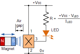 장치를 켜서 LED를 "OFF"시키려면 자기장이 단극 센서의 경우 릴리스 지점 아래로 감소되어야 하고 양극 센서의 경우 자기 북극(음의 가우스)에 노출되어야 합니다. 더 큰 전류 부하를 전환하기 위해 홀 효과 센서 의 출력이 필요한 경우 LED를 더 큰 전력 트랜지스터로 교체할 수 있습니다 .