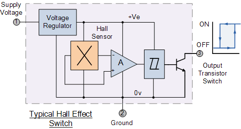 이 트랜지스터는 포화 영역에서 적용된 자속 밀도가 "ON" 사전 설정 지점보다 높을 때마다 출력 단자를 접지로 단락시키는 NPN 싱크 스위치로 작동합니다.