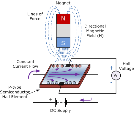 자기장을 이용하여 측정 가능한 전압을 생성하는 효과를 1870년대 에드윈 홀(Edwin Hall)이 발견한 홀 효과 의 기본 물리적 원리는 로렌츠 힘(Lorentz force)을 따서 홀 효과(Hall Effect)라고 합니다. 장치 전체에 전위차를 생성하려면 자속선이 전류 흐름에 수직(90 ° )이어야 하며 올바른 극성(일반적으로 남극)이어야 합니다.