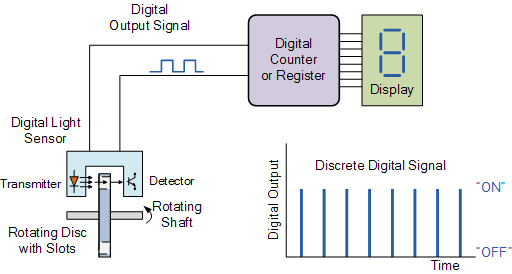 위의 간단한 예에서 회전 샤프트의 속도는 디지털 LED/광검출기 센서를 사용하여 측정됩니다. 회전 샤프트(예: 모터 또는 로봇 휠)에 고정된 디스크에는 디자인 내에 여러 개의 투명 슬롯이 있습니다. 디스크가 샤프트의 속도에 따라 회전함에 따라 각 슬롯은 센서를 통과하여 논리 "1" 또는 논리 "0" 레벨을 나타내는 출력 펄스를 생성합니다.