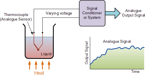 아날로그 센서는 일반적으로 측정되는 양에 비례하는 연속 출력 신호 또는 전압을 생성합니다. 온도, 속도, 압력, 변위, 변형 등과 같은 물리량은 본질적으로 연속적인 경향이 있으므로 모두 아날로그 수량입니다. 예를 들어, 액체의 온도는 액체가 가열되거나 냉각됨에 따라 온도 변화에 지속적으로 반응하는 온도계 또는 열전대를 사용하여 측정할 수 있습니다.