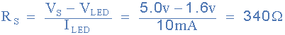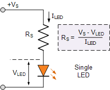 표준 LED는 5~25mA 사이의 순방향 전류로 작동할 수 있으므로 대부분의 출력 인터페이스 포트에서 LED를 직접 구동할 수 있습니다. 일반적인 컬러 LED는 합리적으로 밝은 디스플레이를 제공하기 위해 약 10mA의 순방향 전류가 필요합니다. 따라서 단일 빨간색 LED가 1.6V의 조명을 받을 때 순방향 전압 강하를 가지며 10mA를 공급하는 5V 마이크로 컨트롤러의 출력 포트에 의해 작동된다고 가정하면. 그런 다음 필요한 전류 제한 직렬 저항 RS 값은 다음 과 같이 계산됩니다.