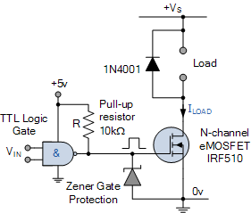 풀업 저항은 TTL 공급 레일과 MOSFET 게이트 터미널에 연결된 로직 게이트 출력 사이에 연결됩니다. TTL 논리 게이트 출력이 논리 레벨 "0"(LOW)에 있을 때 MOSFET은 "OFF"이고 논리 게이트 출력이 논리 레벨 "1"(HIGH)에 있을 때 저항기는 게이트 전압을 + 5V 레일.