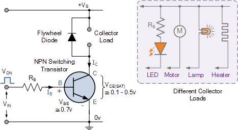 트랜지스터를 완전히 ON(포화)으로 전환하면 트랜지스터 스위치는 닫힌 스위치처럼 효과적으로 작동합니다. 즉, 콜렉터 전압은 이미터 전압과 동일한 전압입니다. 그러나 솔리드 스테이트 장치이기 때문에 포화된 경우에도 VCE (SAT) 라고 하는 트랜지스터 단자 전체에 항상 작은 전압 강하가 발생합니다 . 이 전압 범위는 트랜지스터에 따라 약 0.1~0.5V입니다.