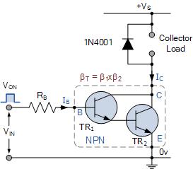 그러면 두 이득을 β T = β 1 × β 2 로 곱하므로 TR 2 의 현재 이득은 β 1 β 2 I B1 이 됩니다 . 즉, 단일 달링턴 트랜지스터 쌍을 만들기 위해 함께 결합된 한 쌍의 바이폴라 트랜지스터는 전류 이득을 함께 곱하게 됩니다.