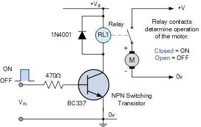 트랜지스터 베이스에 대한 입력이 LOW이면 트랜지스터가 "OFF"로 전환되고 이제 릴레이 접점이 열리므로 모터가 정지됩니다. 코일을 비활성화하여 생성된 모든 역기전력은 환류 다이오드를 통해 흐르고 트랜지스터 손상을 방지하기 위해 천천히 0으로 감소합니다. 또한 트랜지스터(또는 MOSFET)는 절연되어 있으며 모터 작동으로 인해 발생하는 소음이나 전압 스파이크의 영향을 받지 않습니다.
