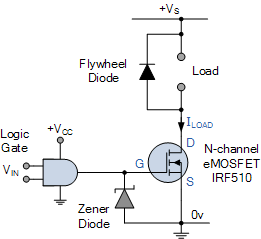 앞서 설명한 것처럼 n채널 eMOSFET는 게이트와 소스 사이에 적용되는 전압에 의해 구동되므로 그림과 같이 MOSFET의 게이트-소스 접합부에 제너 다이오드를 추가하면 다음과 같은 과도한 양 또는 음 입력 전압으로부터 트랜지스터를 보호하는 역할을 합니다. 예를 들어, 포화된 연산 증폭기 비교기 출력에서 생성된 것입니다. 제너는 양의 게이트 전압을 고정하고 게이트 전압이 -0.7V에 도달하면 전도를 시작하는 기존 다이오드 역할을 하여 게이트 단자를 역방향 항복 전압 한계에서 멀리 유지합니다.