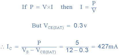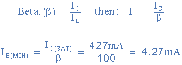 IC 는 램프(부하) 전류와 동일 하므로 트랜지스터 베이스 전류는 I B = I C /β 처럼 트랜지스터의 전류 이득에 상대적입니다 . 전류 이득은 이전에 β = 100 으로 주어졌으므로 최소 베이스 전류 I B(MIN) 는 다음과 같이 계산됩니다.