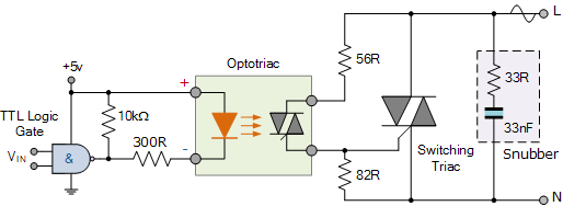 이러한 유형의 광커플러 구성은 마이크로 컨트롤러, PIC 또는 디지털 회로의 출력 인터페이스에서 직접 램프 및 모터와 같은 AC 주 전원 부하를 제어하는 데 사용할 수 있는 매우 간단한 솔리드 스테이트 릴레이 애플리케이션의 기초를 형성합니다.