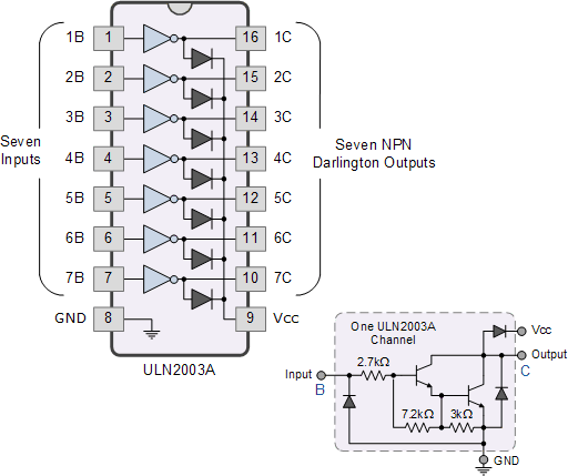 ULN2003A Darlington 드라이버는 TTL 또는 +5V CMOS 로직 게이트에서 직접 구동할 수 있는 매우 높은 입력 임피던스와 전류 이득을 제공합니다. +15V CMOS 로직의 경우 ULN2004A를 사용하고 최대 100V의 더 높은 스위칭 전압의 경우 SN75468 Darlington 어레이를 사용하는 것이 더 좋습니다.