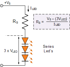 두 개 이상의 LED를 직렬로 연결하는 것은 위에서 본 것처럼 단일 LED를 사용하는 것과 다르지 않지만 이번에는 직렬 조합에 있는 추가 LED의 추가 순방향 전압 강하 V LED를 고려해야 합니다 .
