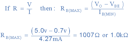 필요한 기본 전류 값을 찾았으므로 이제 기본 저항기 R B(MAX) 의 최대값을 계산해야 합니다 . 제공된 정보에는 트랜지스터의 베이스가 디지털 논리 게이트의 5.0v 출력 전압( Vo ) 에서 제어된다는 내용이 나와 있습니다 . 베이스-이미터 순방향 바이어스 전압이 0.7V인 경우 R B 값은 다음과 같이 계산됩니다.