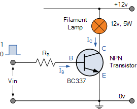 적절한 출력 인터페이싱 트랜지스터 스위치 회로를 통해 TTL 5.0v 디지털 논리 게이트의 출력을 사용하여 12V 공급 장치에 연결된 5W 필라멘트 램프의 작동을 제어한다고 가정해 보겠습니다. DC 전류 게인(컬렉터(출력)과 베이스(입력) 전류의 비율), 트랜지스터의 베타(β)가 100인 경우(이 Beta 또는 h FE 값은 사용하는 트랜지스터의 데이터시트에서 확인할 수 있음 ) 완전히 켜졌을 때 V CE 포화 전압은 0.3V입니다. 즉, 콜렉터 전류를 제한하는 데 필요한 기본 저항 R B 의 값은 얼마입니까?