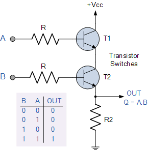 간단한 2-입력 AND 게이트는 아래 그림과 같이 함께 연결된 RTL 저항-트랜지스터 스위치를 사용하여 구성할 수 있으며 입력은 트랜지스터 베이스에 직접 연결됩니다. Q 의 출력을 위해 두 트랜지스터 모두 포화된 "ON" 상태여야 합니다 .