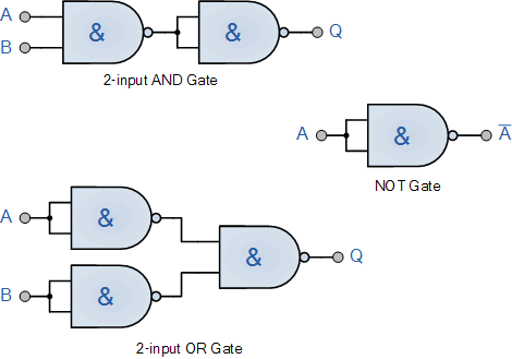 예를 들어 , 이를 다양한 조합으로 연결하면 AND , OR 및 NOT 기능의 세 가지 기본 게이트 유형을 NAND 게이트 만 사용하여 형성할 수 있습니다 .