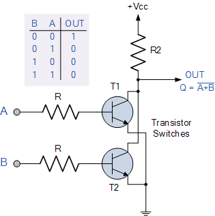 간단한 2입력 논리 게이트는 아래 그림과 같이 함께 연결된 RTL 저항-트랜지스터 스위치를 사용하여 구성할 수 있으며 입력은 트랜지스터 베이스에 직접 연결됩니다. Q 출력을 위해 두 트랜지스터 모두 "OFF"로 차단되어야 합니다 .