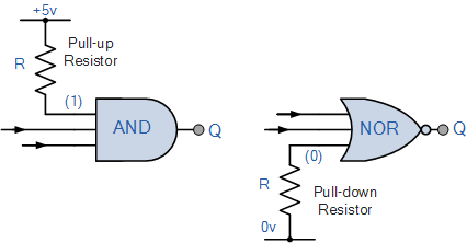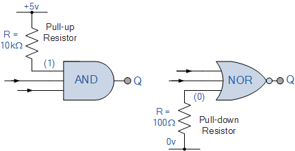 마지막으로 기억해야 할 점은 디지털 논리 게이트를 함께 연결하여 논리 회로를 생성할 때 게이트에 대한 "사용되지 않은" 입력은 적절한 "연결"을 통해 논리 레벨 "1" 또는 논리 레벨 "0"에 직접 연결해야 한다는 것입니다. 풀업” 또는 “풀다운” 저항기(예: 1kΩ 저항기)를 사용하여 고정 논리 신호를 생성합니다. 이렇게 하면 게이트에 대한 사용되지 않은 입력이 "부동"되어 게이트와 회로의 잘못된 스위칭이 발생하는 것을 방지할 수 있습니다.