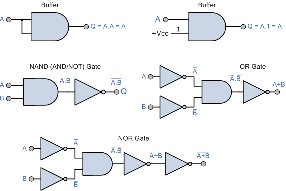 AND , OR 및 NOT 게이트 의 전체 세트를 사용하는 주요 단점 중 하나 는 동등한 논리 게이트 또는 기능을 생성하려면 두 가지(또는 그 이상) 다른 유형의 논리 게이트 AND 및 NOT 또는 OR 및 NOT이 필요하다는 것입니다 . 위에 표시된 대로 세 가지 모두. 그러나 단일 유형의 범용 논리 게이트인 NAND (NOT AND) 또는 NOR (NOT OR) 게이트를 사용하여 다른 모든 부울 함수 및 게이트를 실현할 수 있으므로 필요한 다양한 유형의 논리 게이트 수를 줄일 수 있습니다. , 비용도 마찬가지입니다.