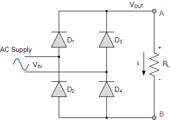 두 경우 모두 입력 파형의 양의 반주기와 음의 반주기는 입력 파형의 극성에 관계없이 양의 출력 피크를 생성하므로 부하 전류는 항상 부하를 통해 동일한 방향으로 흐르고, 점 또는 노드 A 와 노드 사이 R L 은 비 . 따라서 소스의 음의 반주기는 부하에서 양의 반주기가 됩니다.