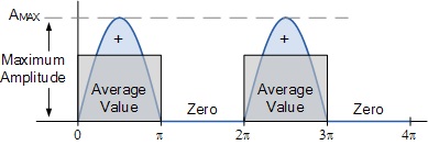 따라서 양의 반주기 동안 A AVE는 0.637*A MAX 와 같습니다 . 그러나 역방향 바이어스 다이오드에 의한 정류로 인해 음의 반주기가 제거되므로 이 음의 반주기 동안의 파형 평균값은 표시된 것처럼 0이 됩니다.