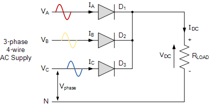이전의 단상 정류기와 마찬가지로 가장 기본적인 3상 정류기 회로는 그림과 같이 위상 당 하나의 다이오드씩 3개의 반도체 다이오드를 사용하는 비제어 반파 정류기 회로입니다.