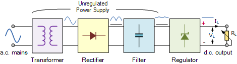 또한 선형 또는 스위칭 형태의 전압 조정기 또는 안정기 회로를 사용하여 다양한 부하 조건에서 전원 공급 장치 출력 전압을 올바르게 조정할 수 있습니다. 그러면 일반적인 DC 전원 공급 장치는 다음과 같습니다.