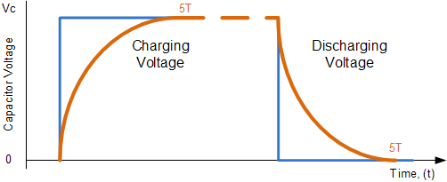 이전 RC 충전 및 방전 튜토리얼에서는 커패시터가 직렬로 연결된 저항기를 통해 자체적으로 충전 및 방전하는 기능을 갖는 방법을 살펴보았습니다. 이 커패시터가 완전히 충전되거나 완전히 방전되는 데 걸리는 시간은 5개의 RC 시간 상수 또는 일정한 DC 전압이 적용되거나 제거될 때 5T와 같습니다.