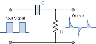 미분기 는 구형파 입력 신호를 출력 시 고주파수 스파이크로 변환할 수 있는 고역 통과 필터 유형의 회로 입니다 . 5RC 시간 상수가 입력 파형의 기간에 비해 짧은 경우 입력 주기의 다음 변경 전에 커패시터가 더 빨리 완전히 충전됩니다.