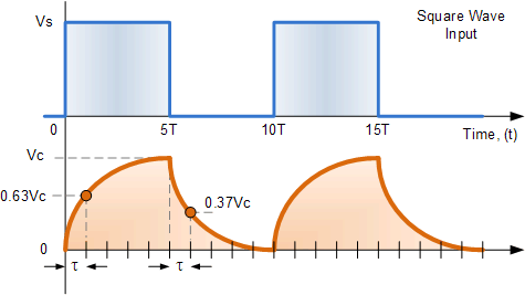 커패시터 양단의 전압 강하는 입력 전압에 따라 Vc 까지 충전 하고 0까지 방전하는 과정을 번갈아 가며 나타납니다. 이 예에서 입력 구형파 전압 파형의 주파수(및 그에 따른 결과 기간, f = 1/T )는 5RC 시간 상수의 두 배와 정확히 일치합니다.