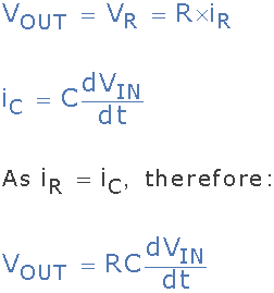 그러면 출력 전압 V OUT 은 RC 상수에 의해 가중치가 부여된 입력 전압 V IN 의 미분 임을 알 수 있습니다 . 여기서 RC는 직렬 회로의 시상수 τ를 나타냅니다.