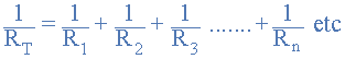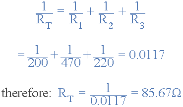 병렬로 연결된 두 개의 저항에 대한 위의 공식을 사용하여 총 회로 저항 R T를 다음과 같이 계산할 수 있습니다 .