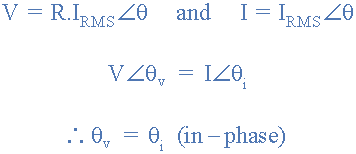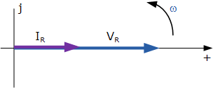 이 "동위상" 효과는 페이저 다이어그램으로도 표현할 수 있습니다. 복소 영역에서 저항은 " j " 또는 허수 성분이 없음을 의미하는 실수일 뿐입니다 . 따라서 전압과 전류는 모두 동위상이므로 위상차( θ = 0 )가 없으므로 동일한 기준축을 따라 각 양의 벡터가 중첩되어 그려집니다. 정현파 시간 영역에서 페이저 영역으로의 변환은 다음과 같이 주어집니다.