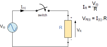 스위치가 닫히면 AC 전압 V가 저항기 R 에 적용됩니다 . 이 전압으로 인해 전류가 흐르게 되며, 이는 인가된 전압이 정현파로 상승 및 하강함에 따라 상승 및 하강하게 됩니다. 부하는 저항이므로 전류와 전압은 둘 다 최대값 또는 피크값에 도달하고 정확히 동시에 0으로 떨어지게 됩니다. 즉, 동시에 상승 및 하강하므로 " 동위상 "이라고 합니다.