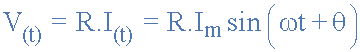 그러면 AC 저항을 통해 흐르는 전류는 시간에 따라 정현파로 변하고 I(t) = Im x sin(Ωt + θ) 로 표현됩니다 . 여기서 Im 은 전류의 최대 진폭이고 θ 는 위상 각도입니다. . 또한 저항을 통해 흐르는 임의의 주어진 전류에 대해 R 단자 의 최대 또는 피크 전압은 옴의 법칙에 의해 다음과 같이 주어질 것이라고 말할 수 있습니다.