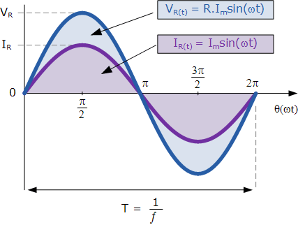 즉, 아래와 같이 전압이 최대, 최소 및 0 값에 도달할 때마다 전류가 최대, 최소 및 0 값을 달성하므로 AC 저항을 사용할 때 전류와 전압 사이에 위상차가 없습니다.