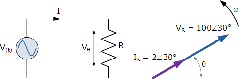 저항 양단의 정현파 전압은 순수 저항 회로의 전원 전압과 동일합니다. 이 전압을 시간 영역 표현에서 페이저 영역 표현으로 변환하면 다음을 얻을 수 있습니다.