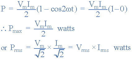 v 와 i 는 서로 "동위상"이므로 cos2Ωt 부분 은 0으로 감소합니다. 그런 다음 한 전체 사이클 동안 저항기에 의해 소비되는 전력은 다음과 같이 주어집니다.
