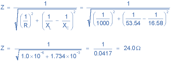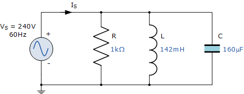1kΩ 저항, 142mH 코일 및 160uF 커패시터 는 모두 240V, 60Hz 전원에 병렬로 연결됩니다. 병렬 RLC 회로의 임피던스와 전원에서 끌어온 전류를 계산합니다.
