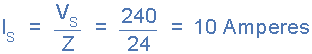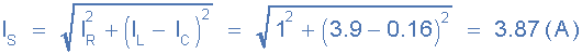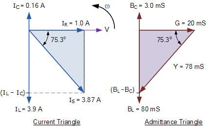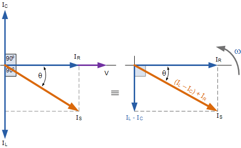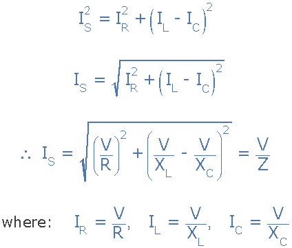 위 오른쪽 페이저 다이어그램에서 현재 벡터가 빗변 I S , 수평 축 I R 및 수직 축 I L – I C 로 구성된 직사각형 삼각형을 생성한다는 것을 알 수 있습니다 . 그러면 이것이 다음을 형성한다는 것을 알 수 있기를 바랍니다. 현재 삼각형 . 따라서 우리는 이 전류 삼각형에 대한 피타고라스의 정리를 사용하여 x축과 y축을 따라 분기 전류의 개별 크기를 수학적으로 얻을 수 있으며, 이는 표시된 대로 이러한 구성 요소의 총 공급 전류 IS 를 결정합니다.