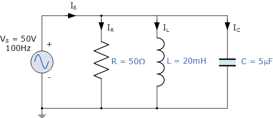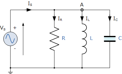 위의 병렬 RLC 회로에서 공급 전압 V S는 세 가지 구성 요소 모두에 공통인 반면 공급 전류 IS는 세 부분으로 구성되어 있음을 알 수 있습니다 . 저항기를 통해 흐르는 전류 I R , 인덕터를 통해 흐르는 전류 IL L 및 커패시터를 통해 흐르는 전류 I C .