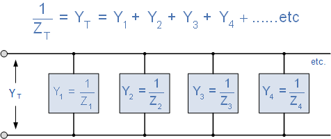 병렬 AC 회로에서는 특히 두 개 이상의 병렬 분기 임피던스가 포함될 때 복잡한 분기 임피던스를 해결하기 위해 어드미턴스를 사용하는 것이 일반적으로 더 편리합니다(수학에 도움이 됩니다). 회로의 총 어드미턴스는 병렬 어드미턴스를 더하여 간단히 구할 수 있습니다. 그러면 회로의 총 임피던스 Z T는 그림과 같이 1/Y T Siemens가 됩니다.