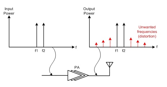 전력 증폭기(PA)에 입력 시 다중 톤 신호가 공급되면 신호를 증폭하고 그 과정에서 원치 않는 상호 변조(IM) 생성물이 생성됩니다.