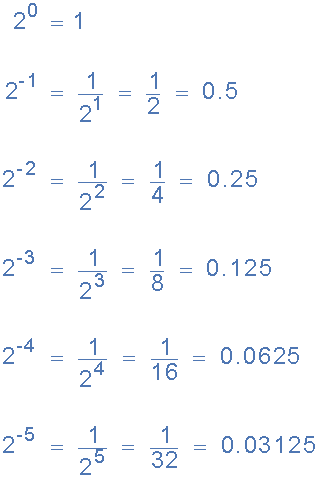 소수 분수와 유사하게, 이진수는 소수점 오른쪽에 이진수를 배치하여 부호 없는 분수(이 경우에는 이진수)로 표시할 수도 있습니다. 따라서 이진수 오른쪽에 있는 모든 소수 자릿수는 2의 음의 거듭제곱인 각각의 가중치를 가지며 이진수를 생성합니다. 즉, 2의 거듭제곱은 음수입니다.