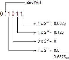 1101.0111 = (1×23) + (1×22) + (0×21) + (1×20) + (0×2-1) + (1×2-2) + (1×2-3) + (1×2-4)
